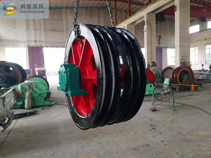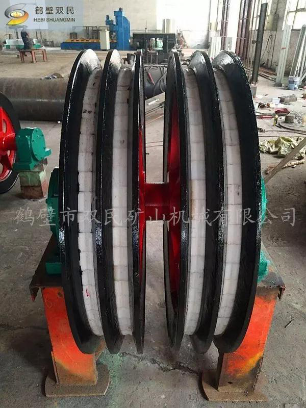 天輪由軸、天輪、滾動軸承、軸承座等組成, 一個天輪固定在軸上,稱為固定天輪,其余天輪其輪轂內(nèi)嵌一個銅套,活裝在軸上,對軸可作相對轉(zhuǎn)動,以消除因各條提升鋼絲繩的速度差對天輪的滑動摩擦。